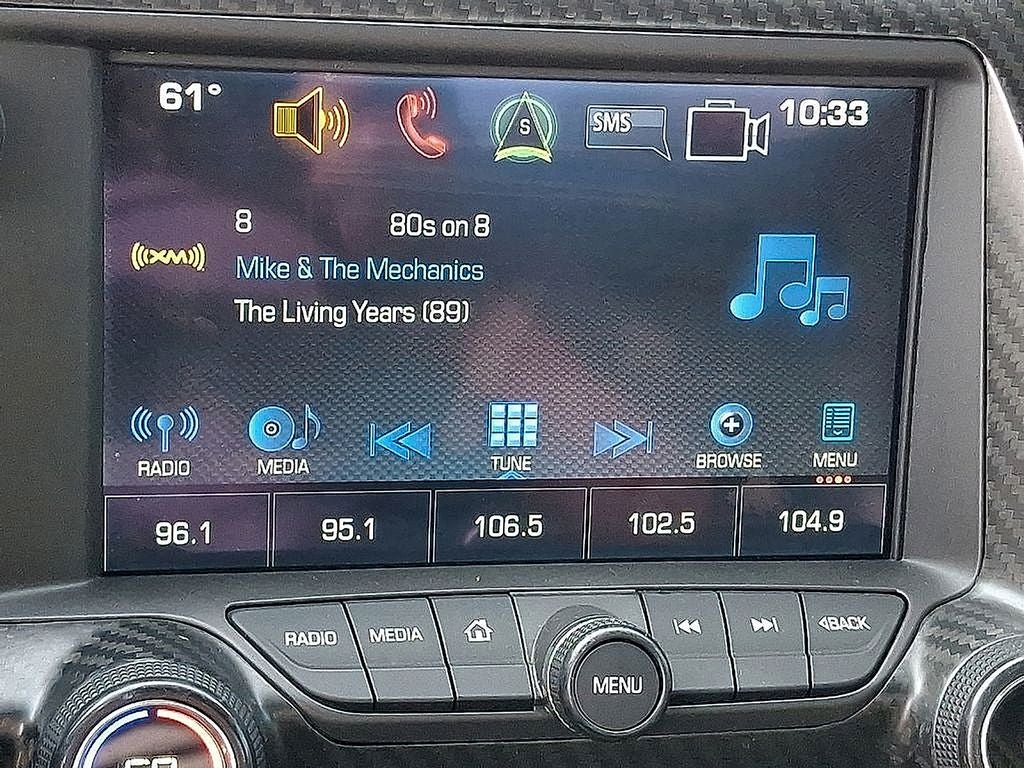 THIS VEHICLE INCLUDES THE FOLLOWING FEATURES AND OPTIONS: 4-Wheel Disc Brakes, 8-Way Driver & Passenger Seat Adjusters, 9 Speakers, ABS brakes, Air Conditioning, Alloy wheels, AM/FM radio: SiriusXM, Apple CarPlay, Automatic temperature control, Bose Premium 9-Speaker Audio System Feature, Bumpers: body-color, Compass, Delay-off headlights, Driver door bin, Driver vanity mirror, Dual front impact airbags, Dual front side impact airbags, Electronic Stability Control, Emergency communication system, Exterior Parking Camera Rear, Four wheel independent suspension, Front anti-roll bar, Front Bucket Seats, Front Center Armrest, Front dual zone A/C, Front reading lights, Fully automatic headlights, GT Bucket Seats, Heated door mirrors, High-Intensity Discharge Headlights, Illuminated entry, Leather Shift Knob, Leather steering wheel, Low tire pressure warning, Occupant sensing airbag, Outside temperature display, Painted Body-Color Carbon Fiber Removable Roof Panel, Panic alarm, Passenger door bin, Passenger vanity mirror, Power door mirrors, Power driver seat, Power passenger seat, Power steering, Power windows, Premium audio system: Chevrolet MyLink, Radio data system, Rear anti-roll bar, Rear window defroster, Remote keyless entry, Speed control, Speed-sensing steering, Spoiler, Sport steering wheel, Steering wheel mounted audio controls, Tachometer, Telescoping steering wheel, Tilt steering wheel, Traction control, Trip computer, Variably intermittent wipers, Voltmeter, and Wheels: 19 x 8.5 Fr & 20 x 10 Rr 5-Split Spoke.